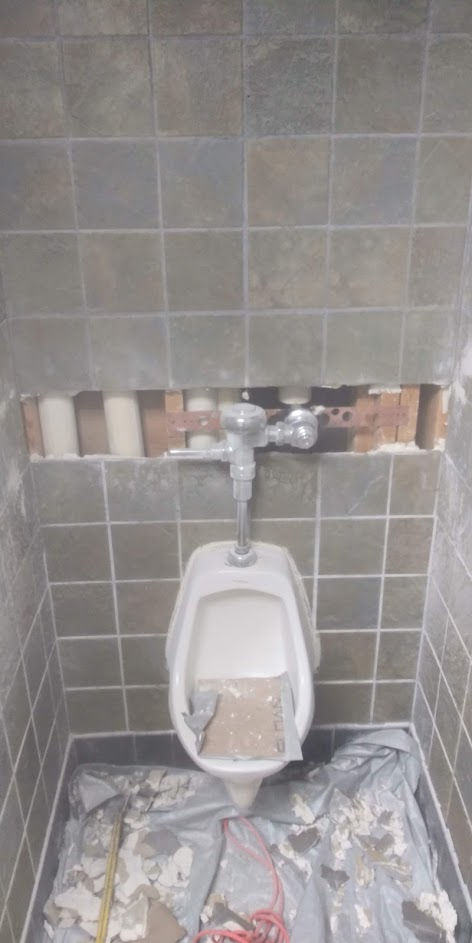 This project showcases unfinished room with bare floor and beige walls, wooden framing in progress, dimly lit hallway under construction with wooden framing, covered patio under construction with garden view, and urinal installation with exposed plumbing and tiles removed.